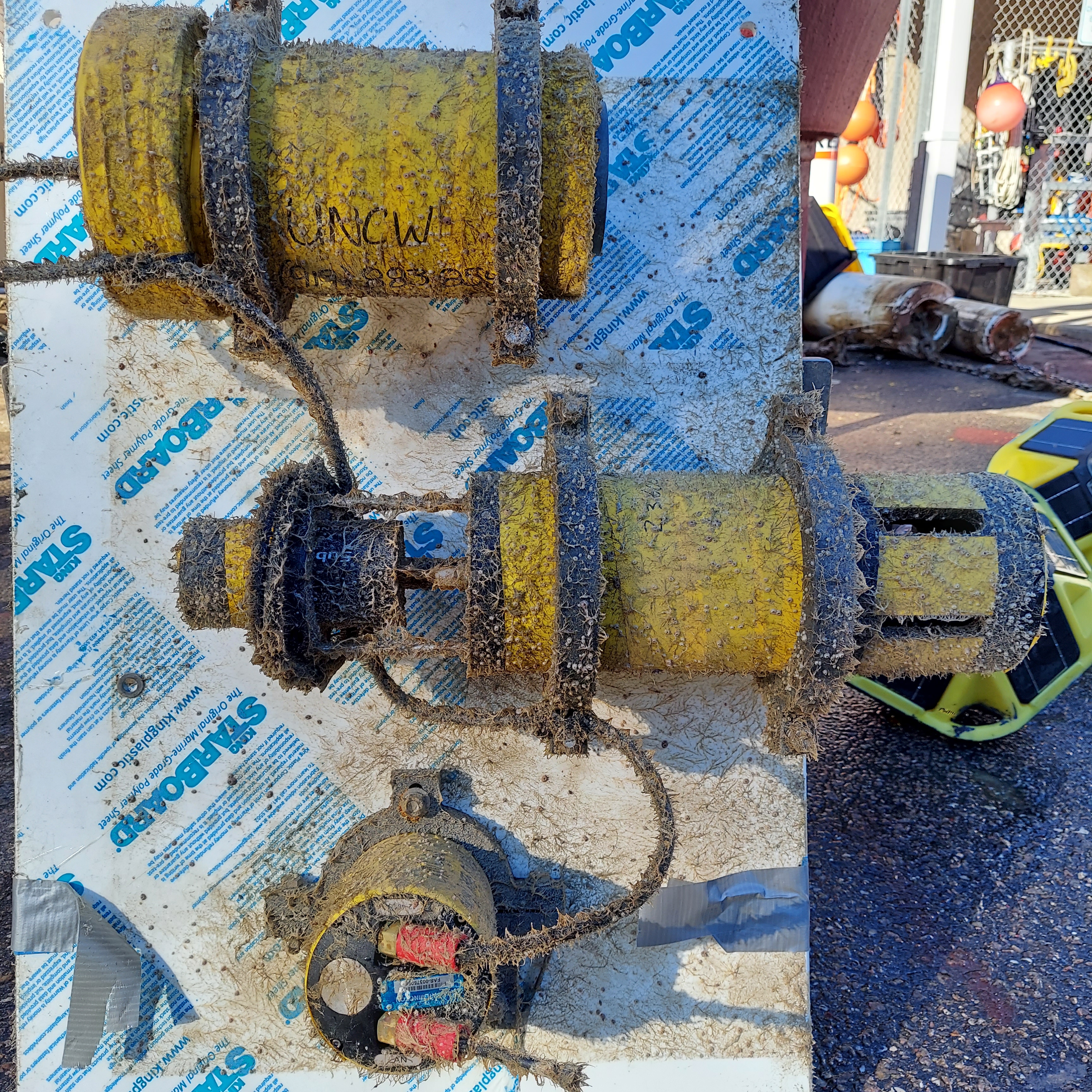 Just before the weather turned, we were able to get out there and recover the array deployed for our first deployment on Frying Pan Shoals. The sea fuzz and muck were serious. Clean up and data download is gonna be a blast!