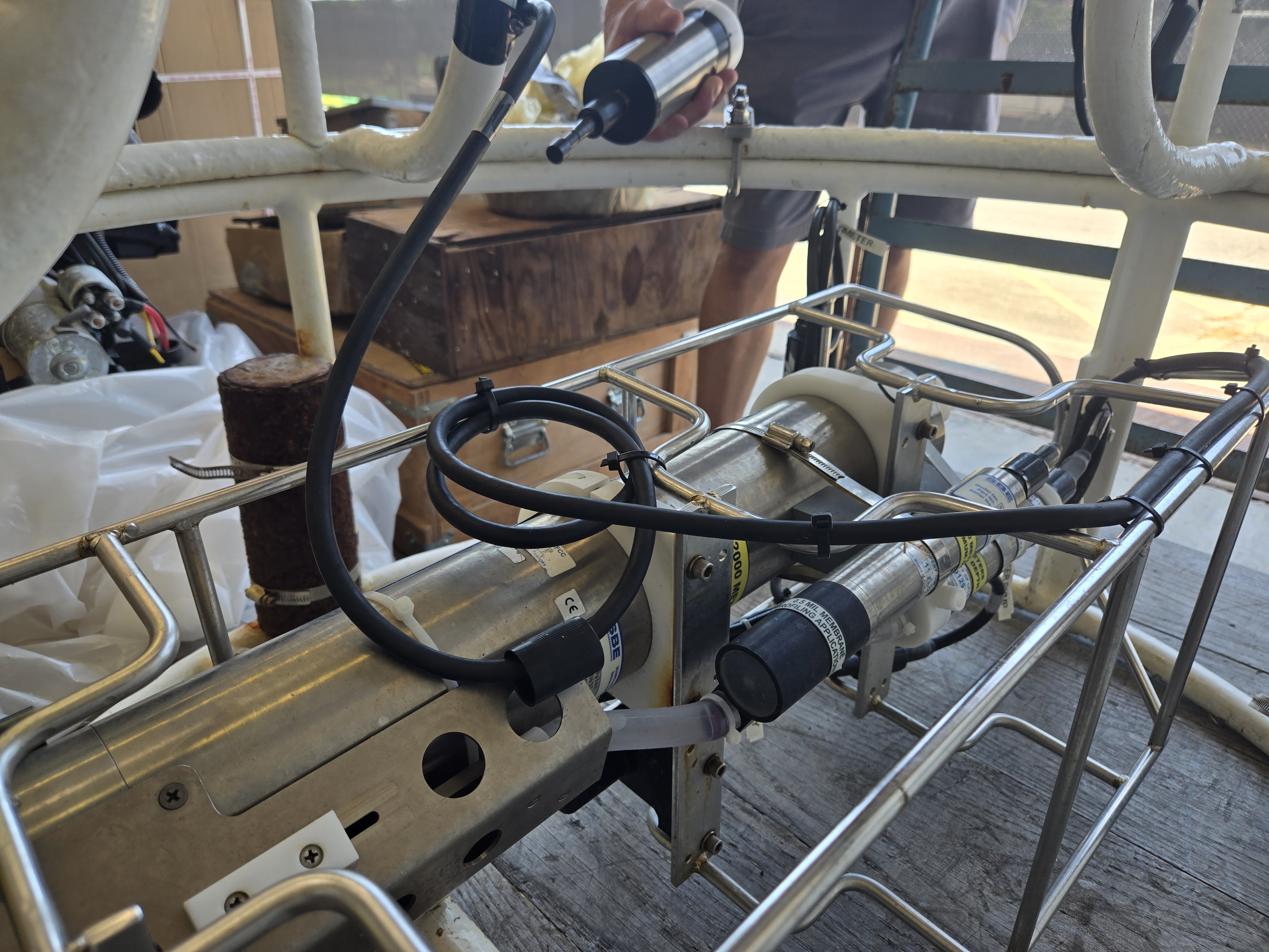 A rosette water sampler is an essential piece of oceanographic equipment. It allows real-time controlled water collection at specific depths and/or water class targets. It is also a very cool piece of engineering. Yesterday, Dave Wells (UNCW) and Bill Davis (CFCC) helped us figure out where we can plug in an ECO chlorophyll-a fluorometer. This will hopefully remove the need for our sampling protocol that involved multiple CTD units alternately being attached and detached (and repeat) from the rosette while we are underway.