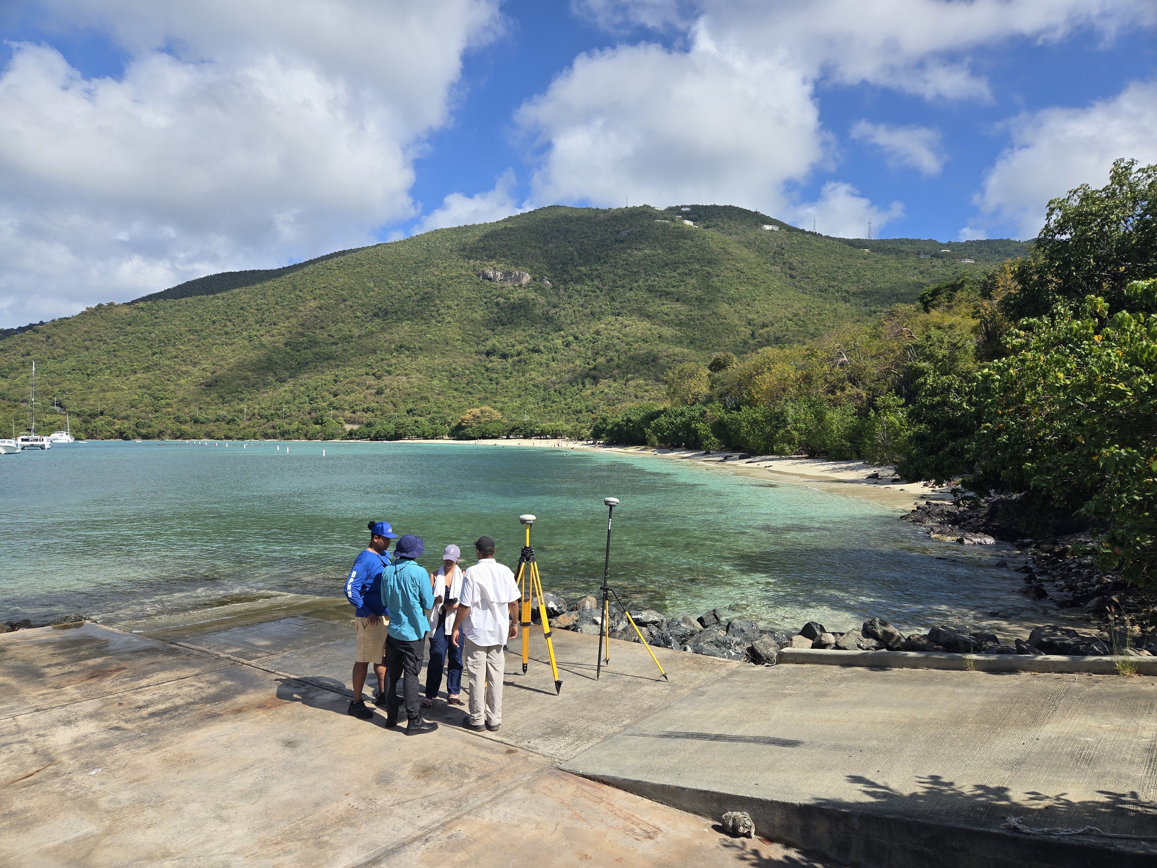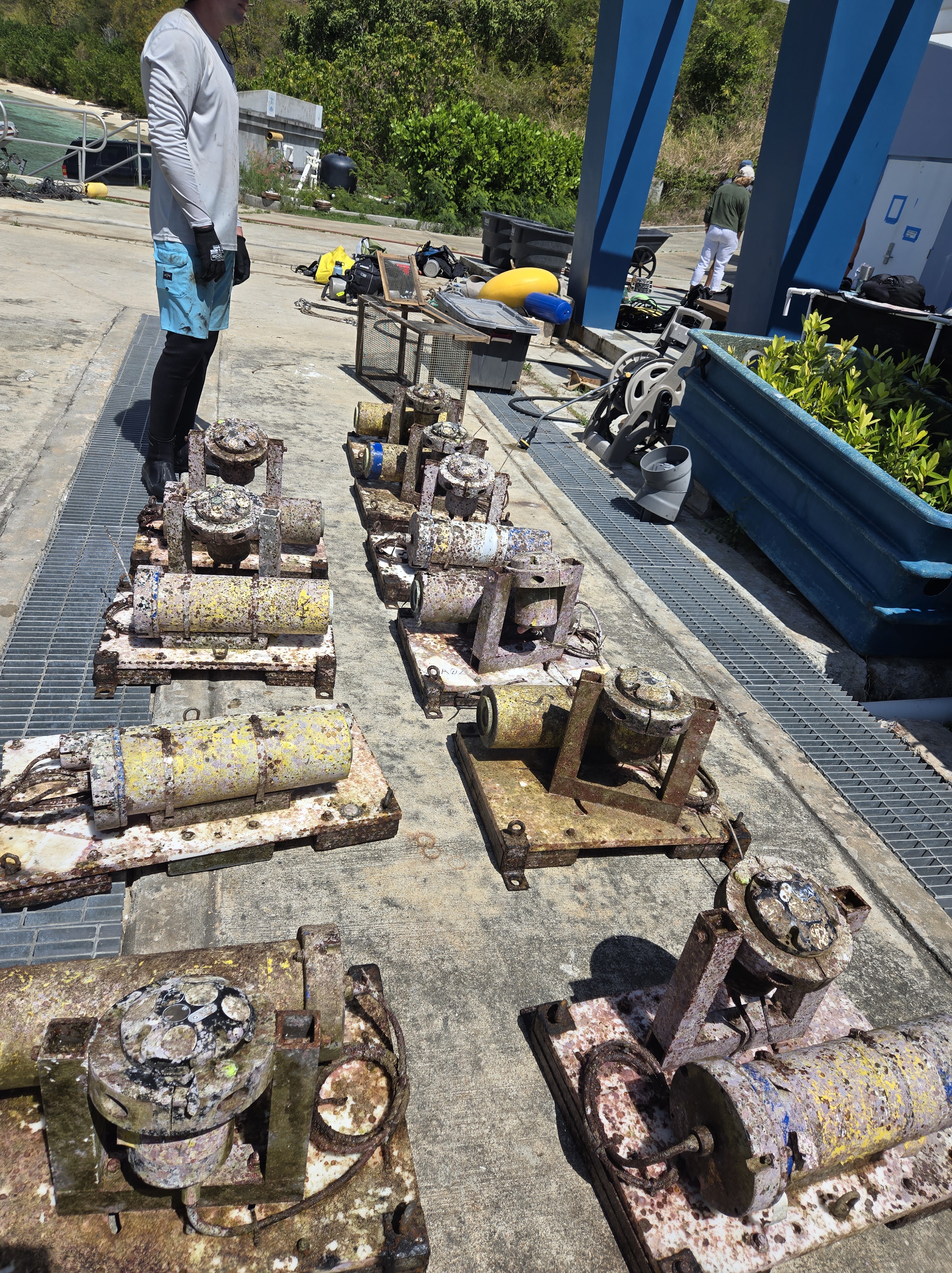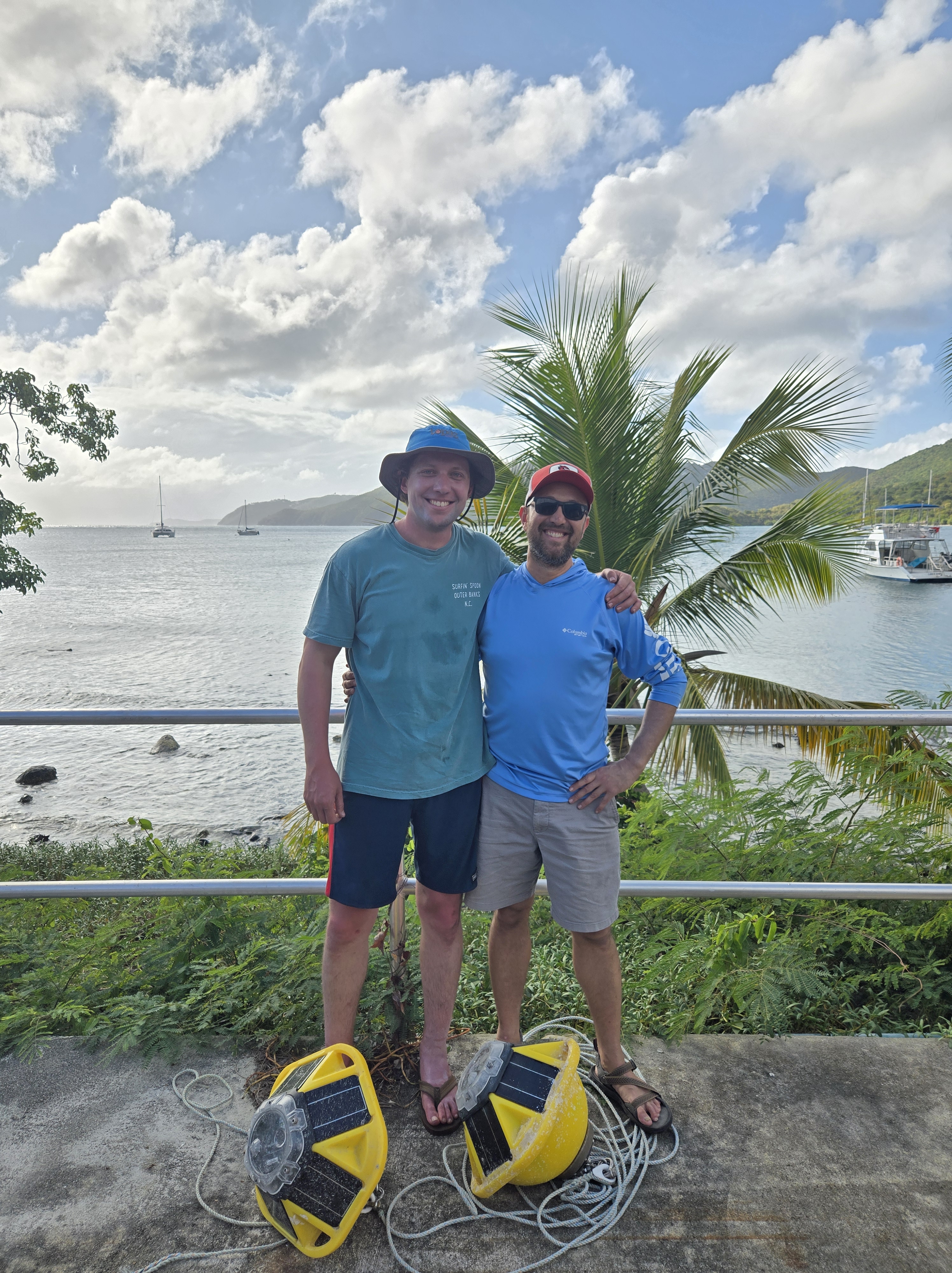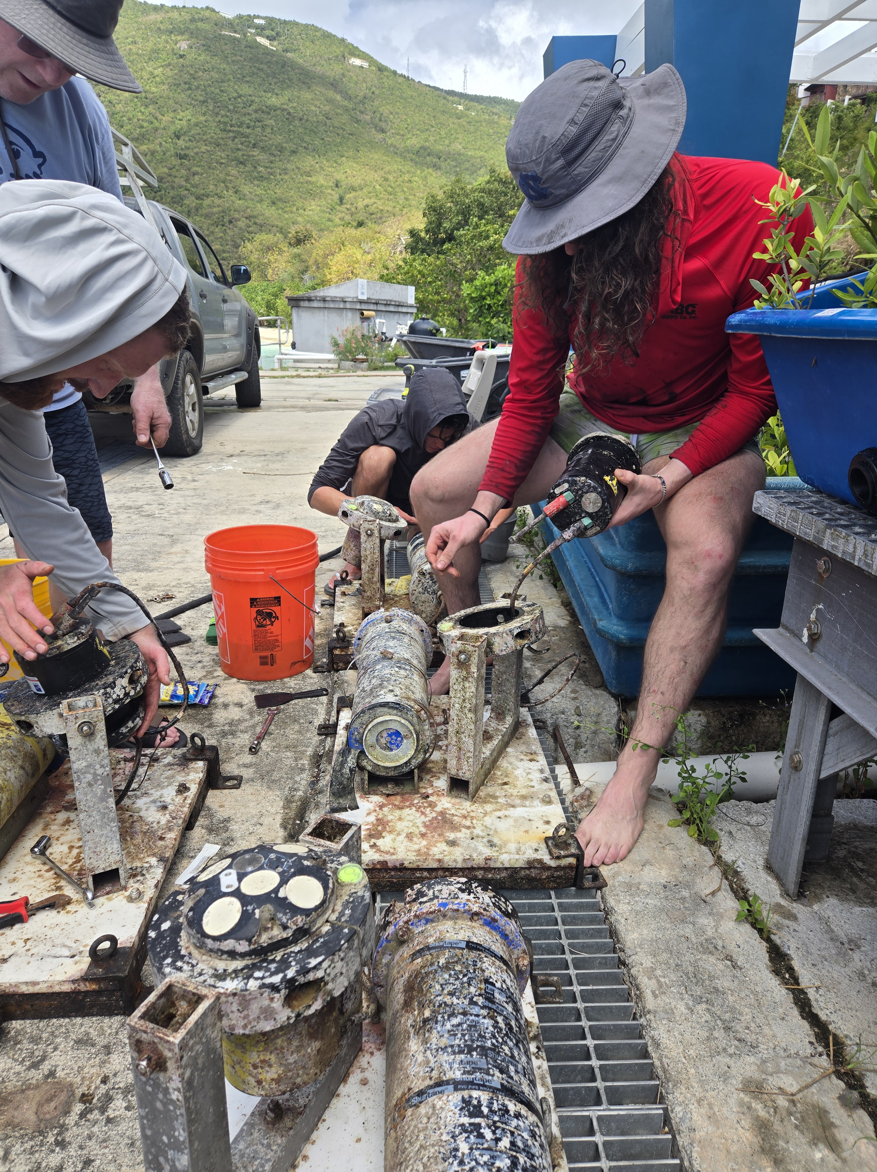 The 3 month experiment on the north shore of St. Thomas approaches completion. As usual, the field team kicked butt diving to recover instruments on and in between rocks, cliffs, crevices, nooks and crannies. Having pulled instruments from the coastal ocean of many places, I cannot get over how different this Caribbean bio-fouling looks. None of this is rust! As an added bonus, how fun to run into old friends and students. Shout out to Dr. Greg Guannel, Director of Caribbean Green Technology Center at UVI (Go Beavs!) and Drew Davey, PhD student at SIO (Go Hawks!)